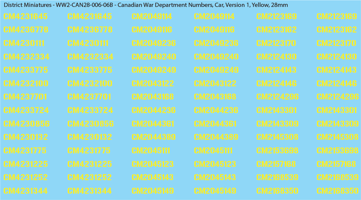 These are WW2 Canadian War Department Numbers for cars. Comes in three different colors for each sheet (White, Yellow, Black).