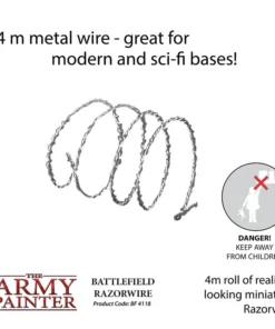 Razorwire gives the effect of a war-torn setting – and is essential for any sci-fi or modern wargaming base. This steel wire, imitating razorwire gives the realistic effect of a war-torn setting. Ideal for 15mm & 28mm miniatures, military dioramas, railway sceneries & terrain model kit.