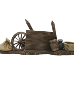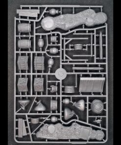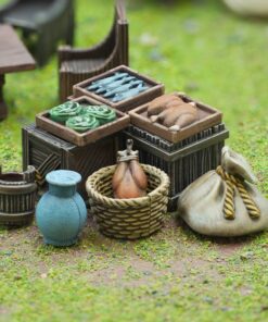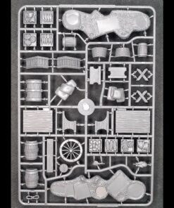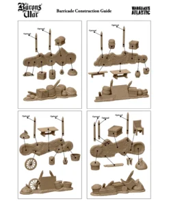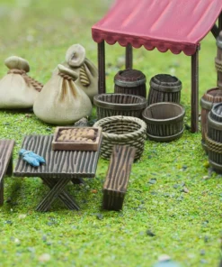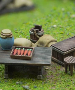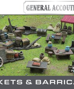 This clever (if we do say so ourselves!) hard plastic set features two unique frames that can be assembled to create 8 barricades. OR the same components (minus the barricade bases) can be built as a full marketplace including covered stalls, trestle tables, chairs, chests, buckets, baskets, barrels, sacks, pots, crates, and a variety of food stuffs!