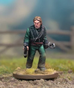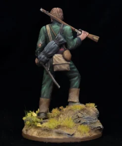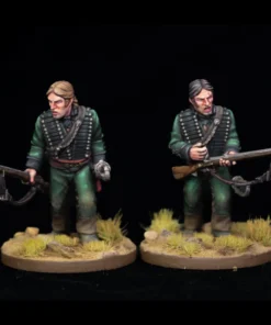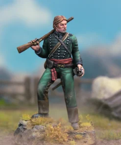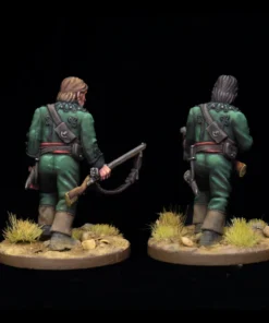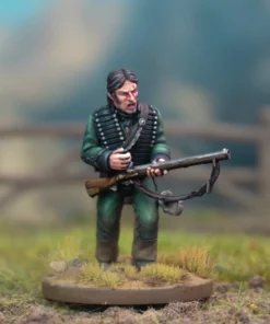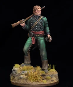 The 54mm model is a display piece that comes with a scenic base. The 28mm version is true multi-part and has two arm and head options shown here and includes a textured base as well. Chris Hindmarsh has painted the two versions – one to look like Sharpe as per the television show and the other depicting Sharpe as described by Bernard Cornwell in the novel: tall, dark haired, and with a savage scar on his left cheek that made him look like an “execution”.