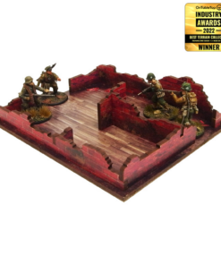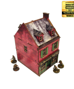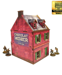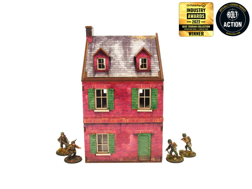 Multicolor prepainted (UV-printed) 3-level WW2 Normandy Cafe building with accessible colorful interiors, removable levels and removable ruined ground floor. Room to fit in the whole infantry squad inside. Pre-cut acrylic transparent window panes included. Option to assemble with open or closed shutters and doors. Optional signboard included.