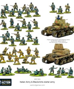 Helmets, sun helmets and caps further allow for temperate or tropical troops to be built so you can field your army in the dusty deserts of North Africa, the islands of the Mediterranean, the harsh cold of Russia, or the Italian home front. Medium mortar, machine gun and anti-tank gun support elements provide additional firepower. Providing armoured support is the M13/40 medium tank which can alternatively be built as a Semovente 75/18 assault gun.